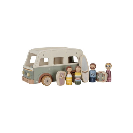 Drewniany camper van przeniesie Twoje dziecko w świat letnich przygód i wspólnego podróżowania. W zestawie znajdują się wszystkie niezbędne elementy, aby rozpocząć wspaniałą wyprawę: camper, cztery drewniane postacie, deska do pływania, koszyk z zakupami oraz walizka.