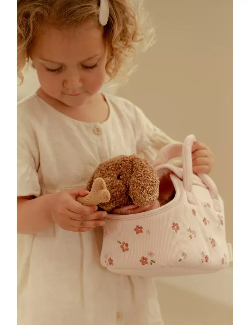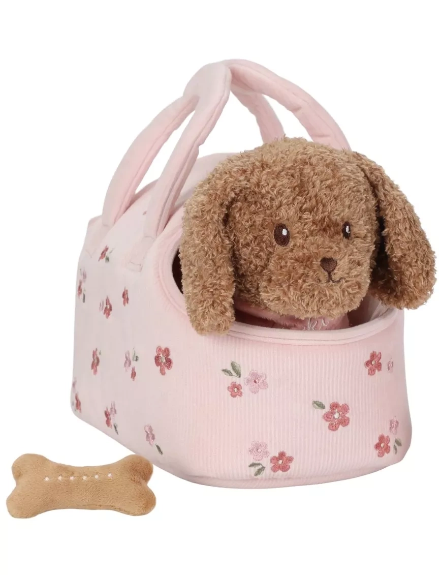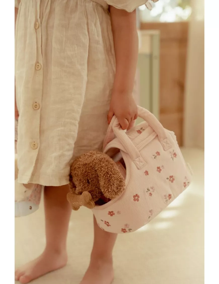 Poznaj Jackie – mięciutkiego pieska, który czeka, aby zostać najlepszym przyjacielem Twojego dziecka. Ukryty w eleganckiej torebce ozdobionej delikatnym, kwiatowym motywem, Jackie jest nie tylko przytulanką, ale też wiernym towarzyszem codziennych przygód.