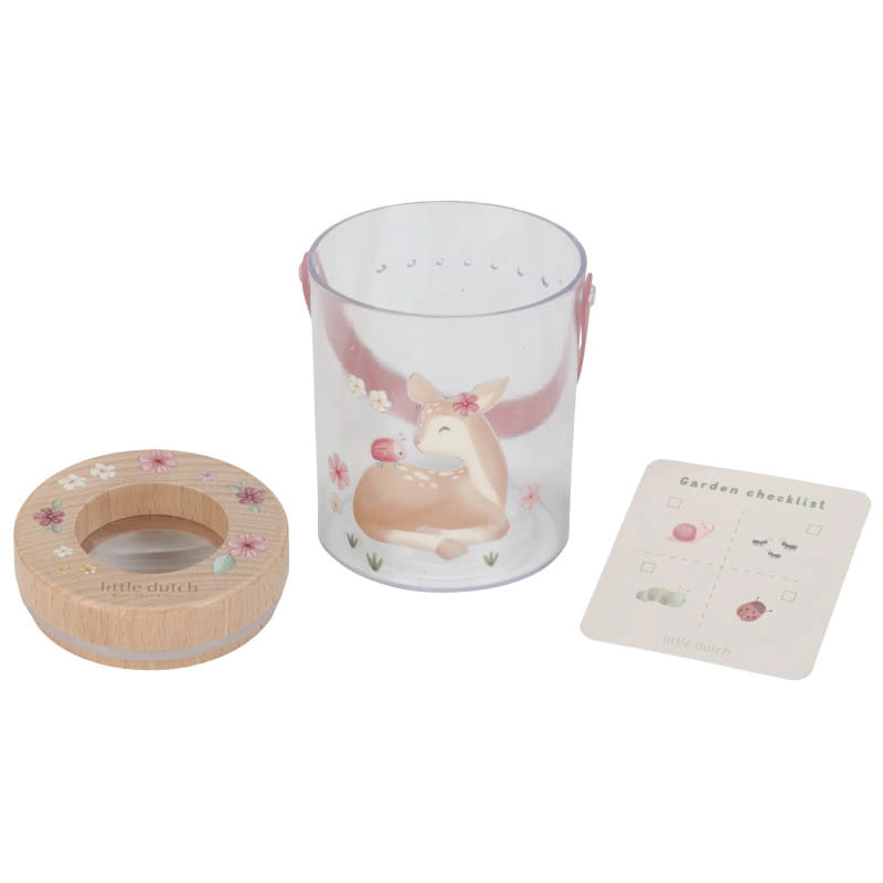 Słoik jest ozdobiony uroczymi motywami Fairy Garden, co nadaje mu dodatkowego uroku. W zestawie znajduje się także karta owadów, na której można zaznaczyć wszystkie poznane gatunki. To świetne narzędzie dla małych odkrywców przyrody i doskonałe uzupełnienie innych produktów z Kolekcji Ogrodowej od Little Dutch.