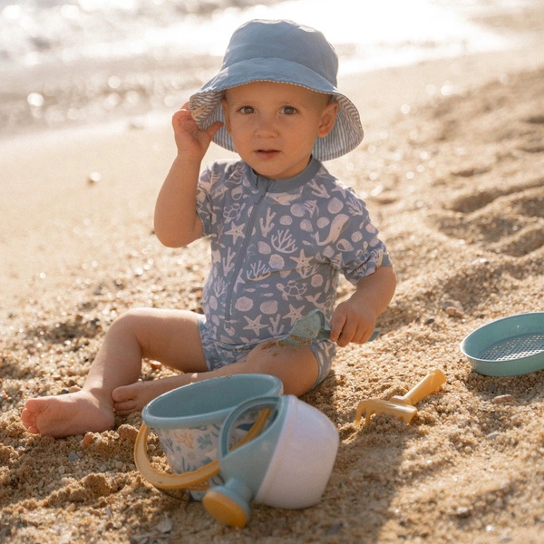 Stylowy, wygodny i praktyczny kostium kąpielowy z krótkim rękawem od Little Dutch to idealny wybór na wakacyjne przygody. Model Sea Life Ocean Blue zachwyca subtelnym wzorem morskich stworzeń i pastelową kolorystyką. Doskonały do zabawy na plaży, w ogrodzie czy nad basenem.