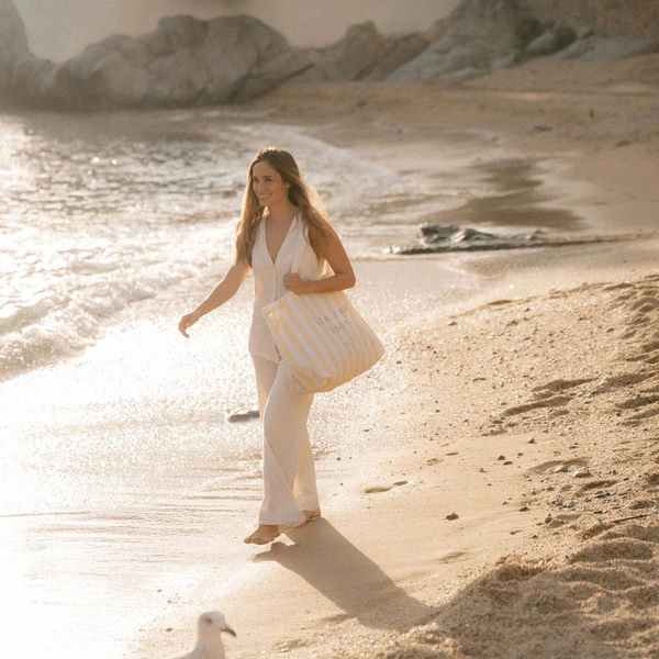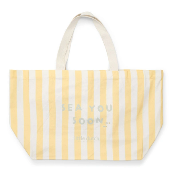 Stylowa, duża torba plażowa od Little Dutch w słoneczne, żółto-białe pasy to idealny towarzysz na letnie wypady z dzieckiem! Pojemna, lekka i praktyczna – pomieści wszystkie plażowe niezbędniki, od ręczników po zabawki.