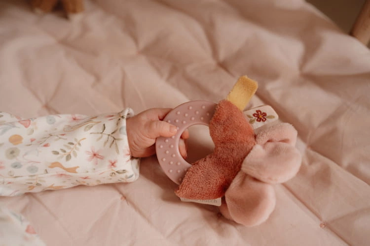 - Gryzak w formie kółka z kwiatkiem – pomaga w czasie ząbkowania, wspiera rozwój motoryki i koordynację ręka-oko