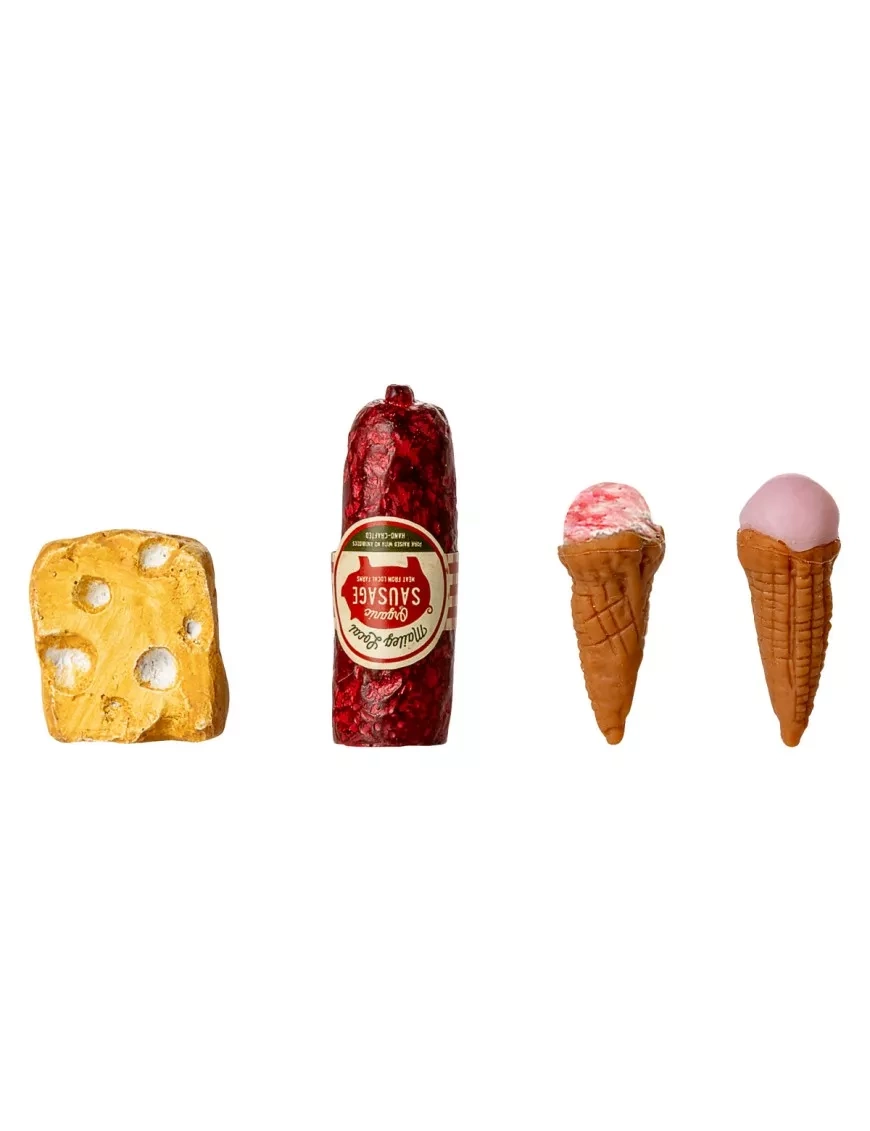 W komplecie miniaturowe akcesoria: ser, kiełbasa, lody