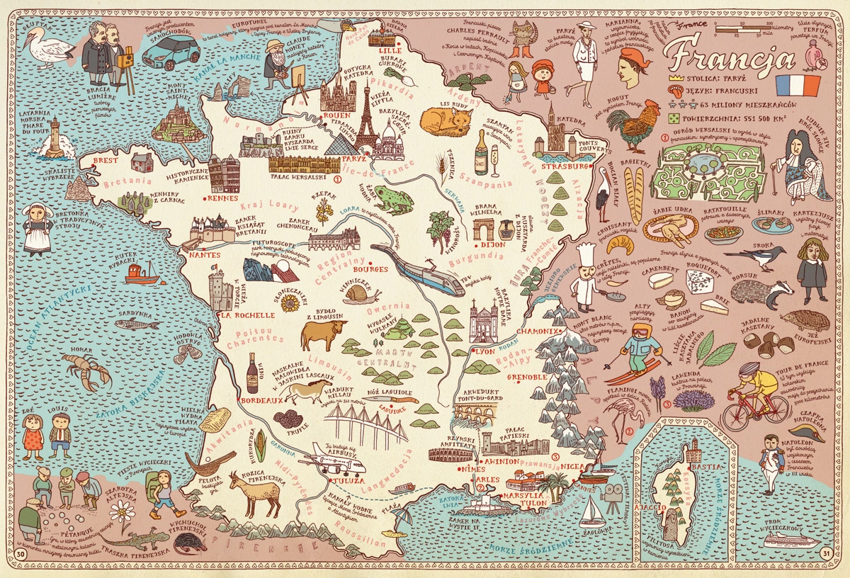 Książka zawiera 51 ogromnych map, które poprowadzą was przez 42 kraje i 6 kontynentów. Każda mapa jest bogato ilustrowana i pełna szczegółów oraz ciekawostek, które przeniosą was w wyjątkowe miejsca, zachęcając do dalszego odkrywania. To doskonała okazja, aby poszerzyć swoją wiedzę o świecie, a także rozbudzić pasję do podróży. Przygotujcie się na wspaniałą przygodę – udanej podróży!