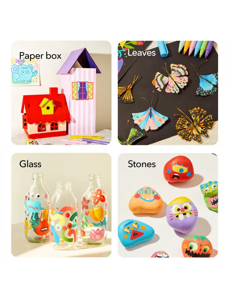 Świetnie sprawdzają się na różnych powierzchniach, takich jak papier, karton, drewno czy szkło. Można nimi nawet ozdobić własne opakowanie – a dzięki praktycznemu paskowi, zabrać cały zestaw w drogę.
