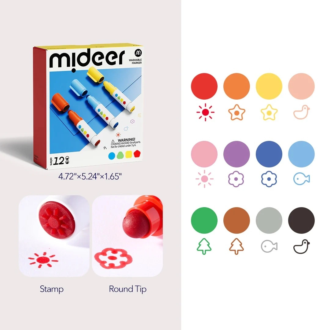Markery zmywalne dwustronne –okrągła końcówka i stempel mideer –12 kolorów