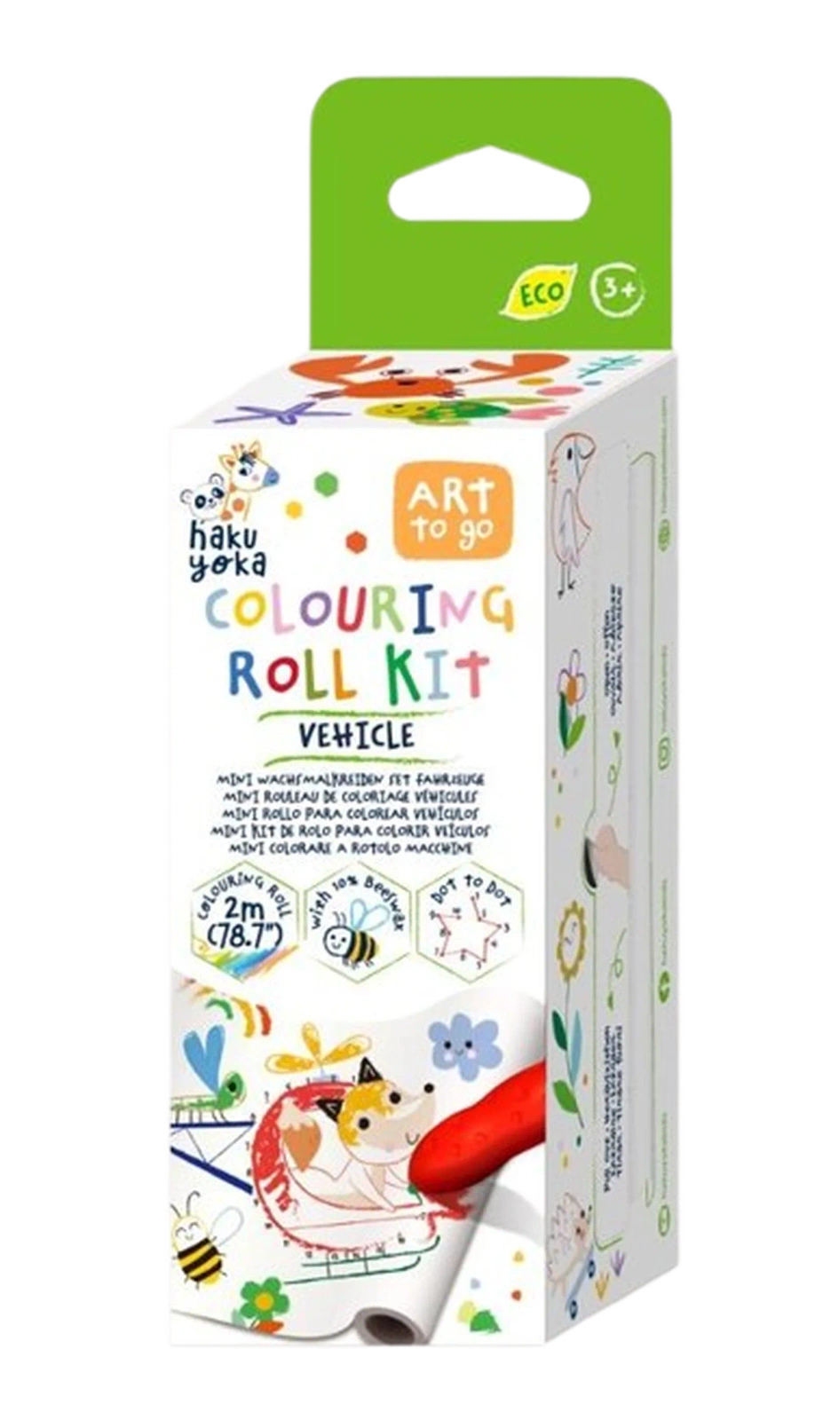 - Mini zestaw do kolorowania: 2-metrowa rolka, 4 ekologiczne kredki z woskiem pszczelim i 20 naklejek. Kreatywna zabawa z łatwym dzieleniem się rysunkami dzięki perforacji.