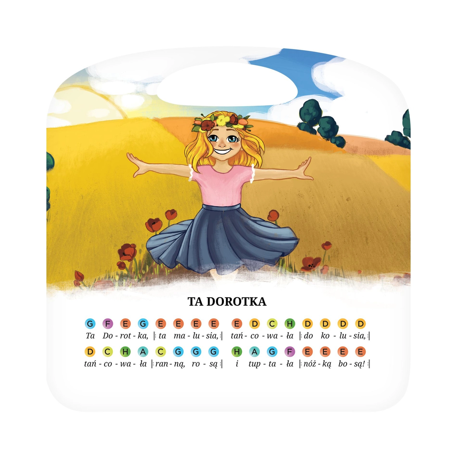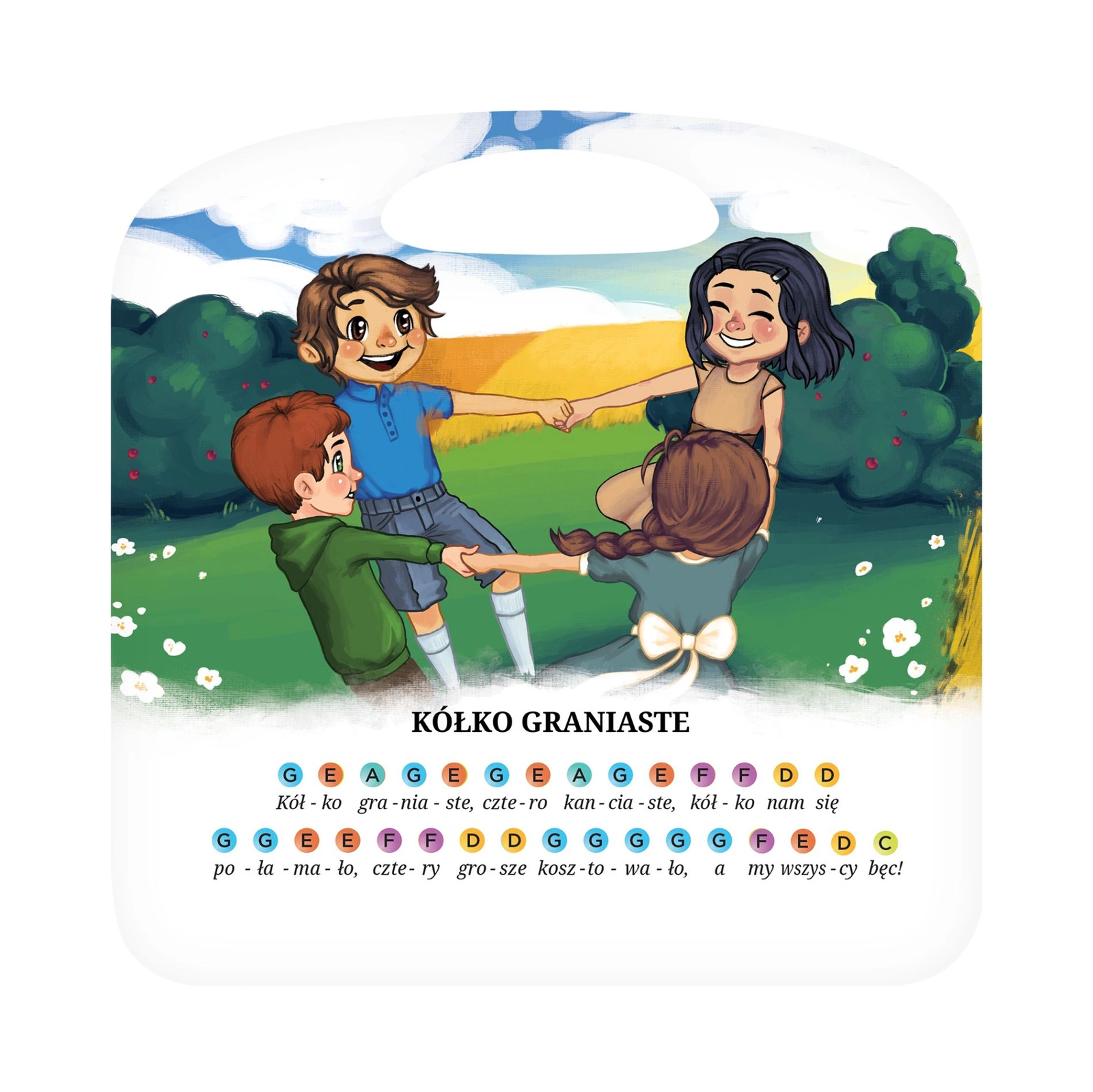Interaktywna książka dźwiękowa zawiera 12 znanych piosenek dziecięcych w wersji wokalnej i instrumentalnej, dzięki którym najmłodsi mogą śpiewać, poznawać nuty i rozwijać muzyczne zainteresowania.