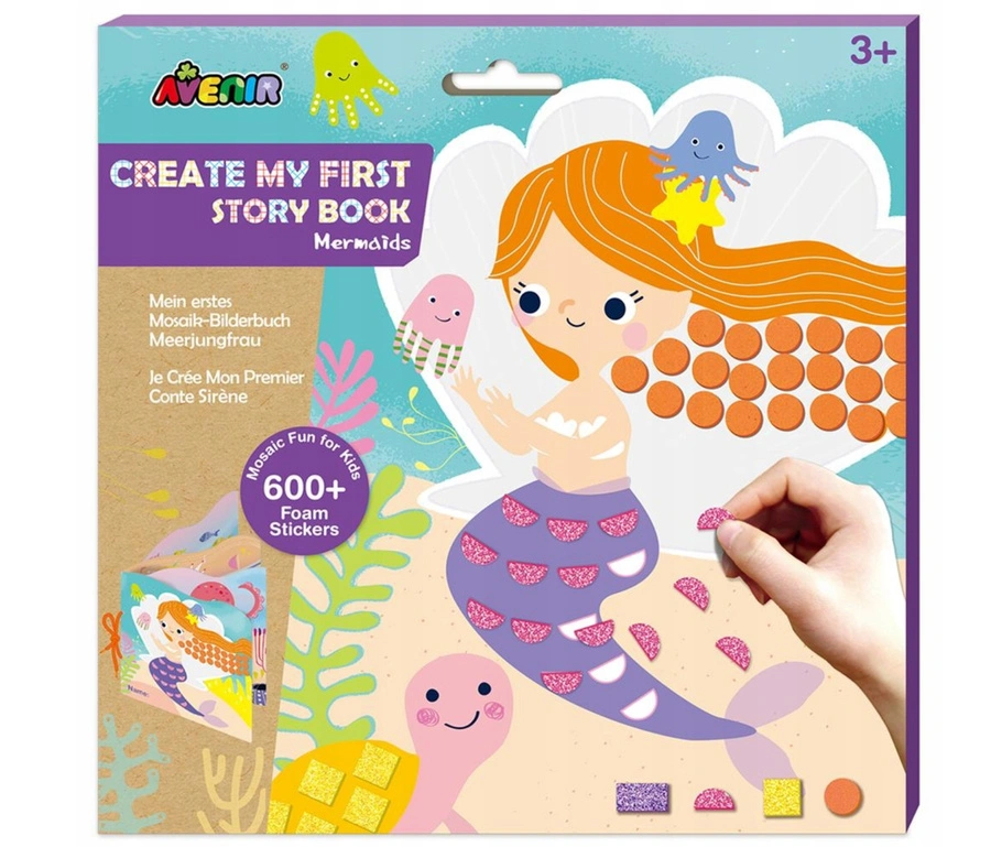Kolorowa książeczka z mozaikami to idealna propozycja dla dzieci, które stawiają pierwsze kroki w świecie sztuki. Dzięki piankowym naklejkom i samoprzylepnym oczom mali artyści krok po kroku stworzą własną, wyjątkową książeczkę z motywem syrenek.