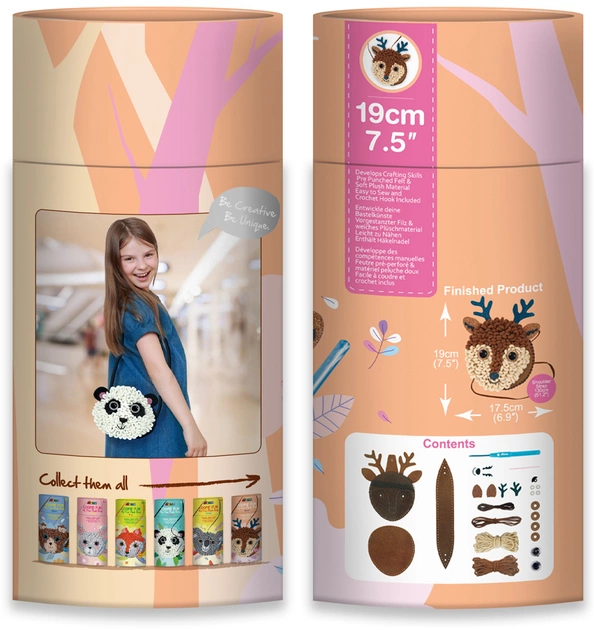 - Zestaw Loopie Fun Craft Kit dla dzieci od 6 lat zawiera filc, włóczkę, szydełko i instrukcje do stworzenia własnej pluszowej torebki za pomocą prostej techniki szycia.