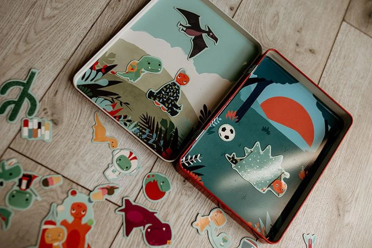 Zestaw magnesów do konstruowania Tiny T.rex amerykańskiej marki Mudpuppy to wyjątkowo kreatywna zabawka dla dzieci od 4. roku życia. Na dwóch magnetycznych planszach znajdują się prehistoryczne tła — dzienne i nocne. Można na nich umieszczać ponad 30 magnesów przedstawiających małe dinozaury oraz akcesoria do zabaw i gier, co pozwala tworzyć wiele ciekawych historii.