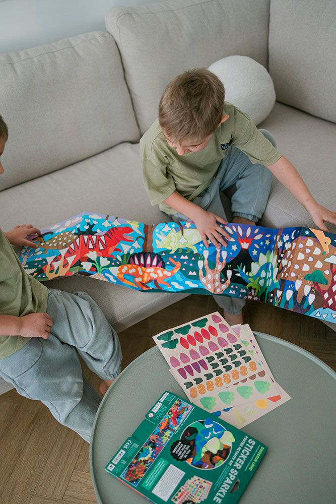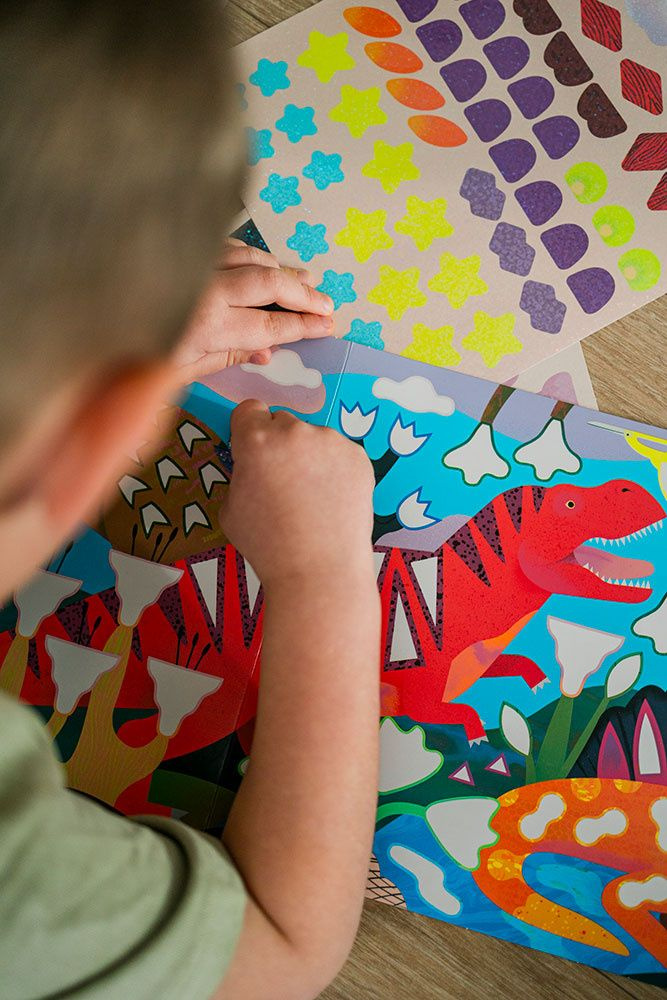 Zestaw kreatywny z naklejkami holograficznymi Kraina dinozaurów amerykańskiej marki MUDPUPPY to doskonała zabawka rozwijająca wyobraźnię i zdolności manualne dzieci od 4. roku życia. W komplecie znajduje się rozkładana plakatowa ilustracja przedstawiająca prehistoryczny świat dinozaurów oraz 5 arkuszy z ponad 200 naklejkami o efektach holo (połysk i odbijanie światła) i brokatu. Dziecko może ozdobić plakat, przyklejając naklejki w wyznaczonych miejscach, tworząc kolorową, błyszczącą kompozycję.
