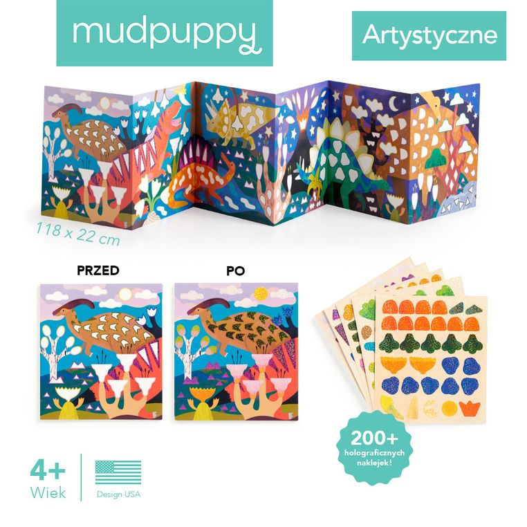 - Zestaw kreatywny z naklejkami holograficznymi Kraina dinozaurów amerykańskiej marki MUDPUPPY to doskonała zabawka rozwijająca wyobraźnię i zdolności manualne dzieci od 4. roku życia.