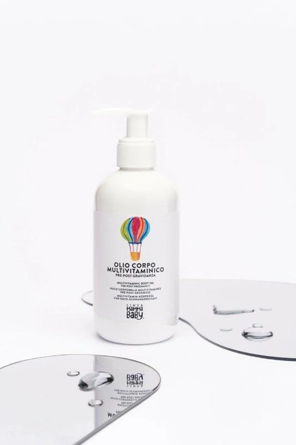 - Multiwitaminowy olejek do pielęgnacji skóry mam przed i po ciąży, bogaty w naturalne olejki i witaminy, wspiera jędrność i elastyczność skóry. O delikatnym kwiatowym zapachu, bez alergenów, odpowiedni dla każdego rodzaju skóry.