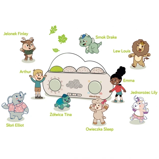 CloudBox™ to niezwykły projektor, który opowiada aż 36 unikalnych historii z udziałem 9 wyjątkowych bohaterów – m.in. zabawnego słonia Elliota, odważnego smoka Drake’a czy ciekawej świata Emmy.