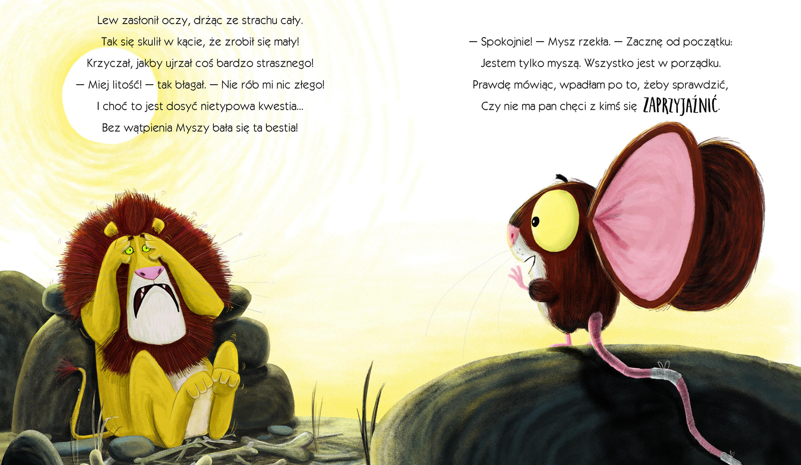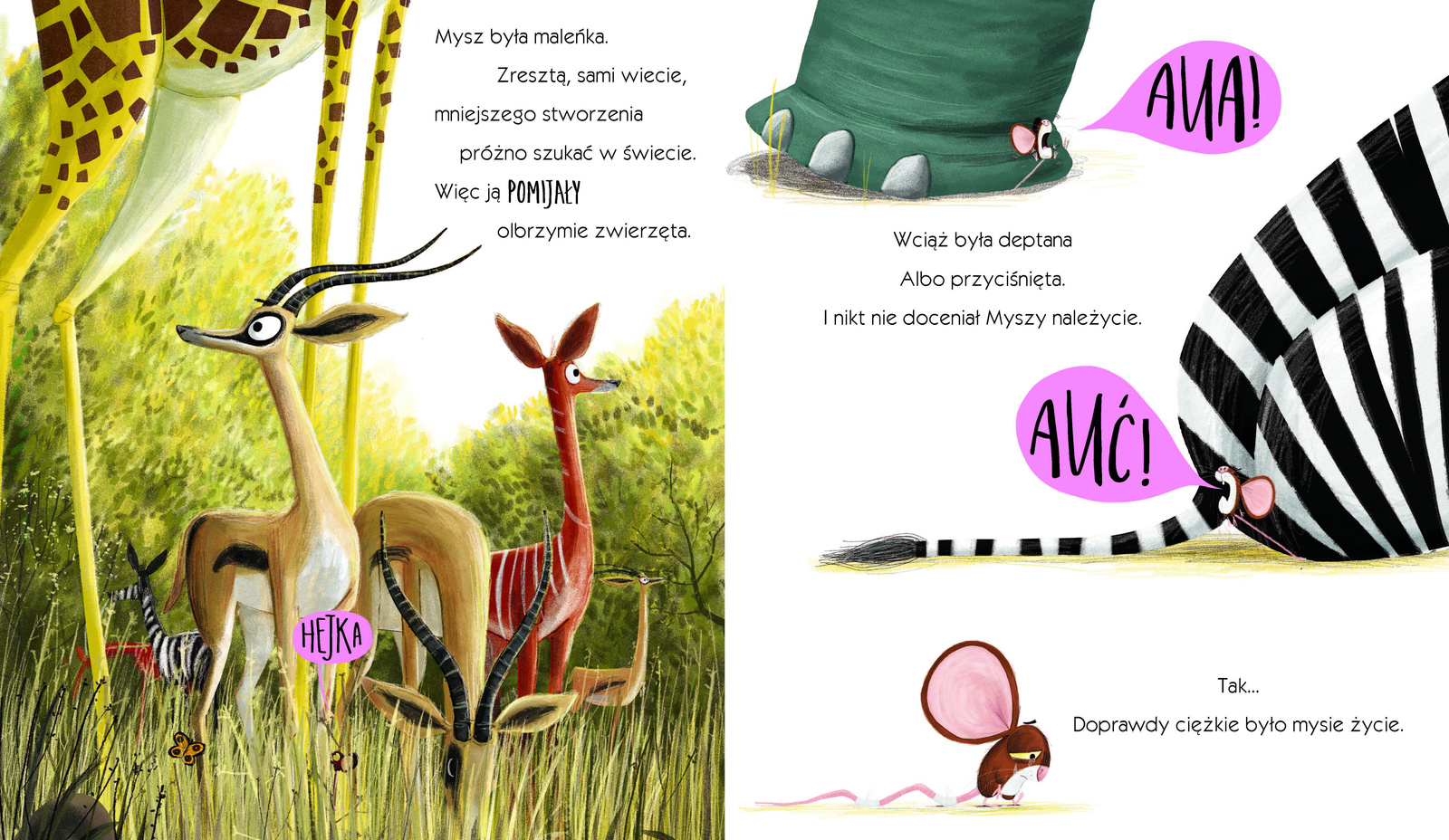 - Poznaj uroczą Myszkę, która marzy o tym, by zostać zauważona. Bycie małym w świecie pełnym dużych i donośnych głosów nie jest proste. Gdy postanawia poprosić groźnego lwa o naukę ryczenia, nie spodziewa się, że ta wyprawa odmieni jej spojrzenie.
