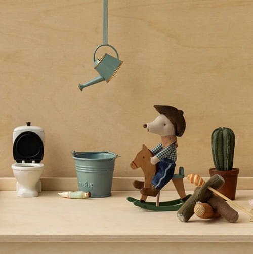 Myszka kowboj na koniku bujanym, Mały brat Oto wyjątkowy zestaw z kolekcji Maileg 2025 – Myszka Młodszy Brat w roli dzielnego kowboja! Ubrana w dżinsy, chustkę i klasyczny kapelusz, myszka rusza na przygodę na swoim koniku bujanym.