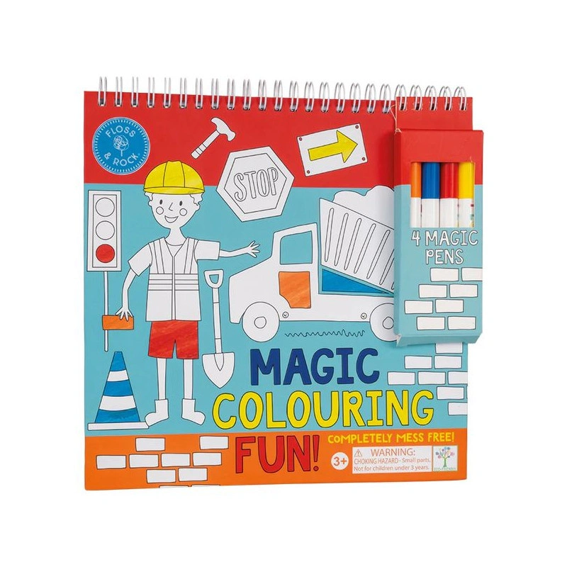 Wystarczy wybrać kolor, rozpocząć rysowanie i obserwować jak na stronach pojawiają się magiczne rysunki przedstawiające koparki, budowniczych, dźwigi i wiele innych motywów związanych z placem budowy. Książeczka z spiralnym grzbietem zawiera 4 magiczne pisaki i 8 kolorowanek.