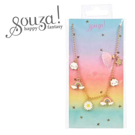 - Złoty naszyjnik Souza! z 6 zawieszkami: tęcza, chmurki, kwiatek i różowy chwost z gwiazdką. Nietoksyczny, nie podrażnia skóry, długość 36 cm. Idealny na prezent dla dzieci 3+.