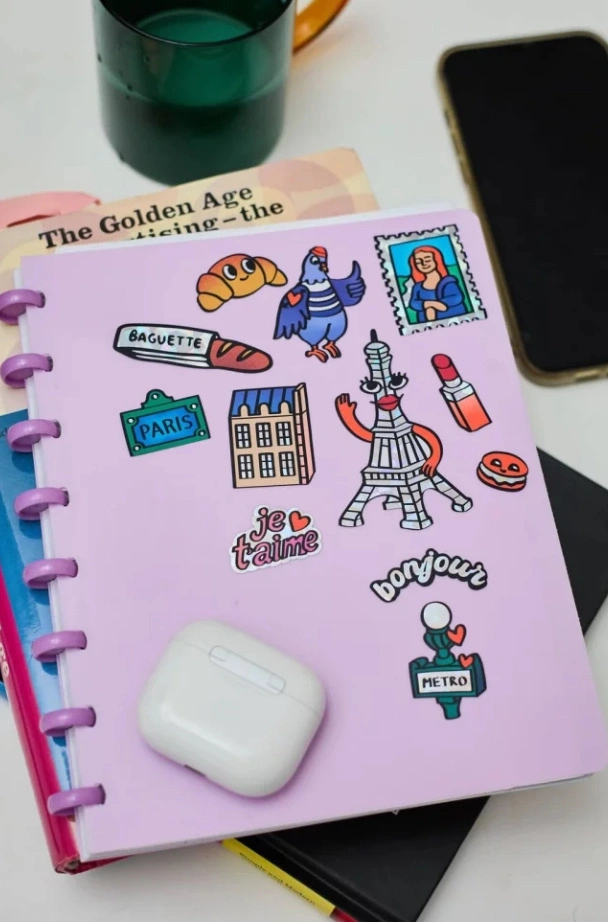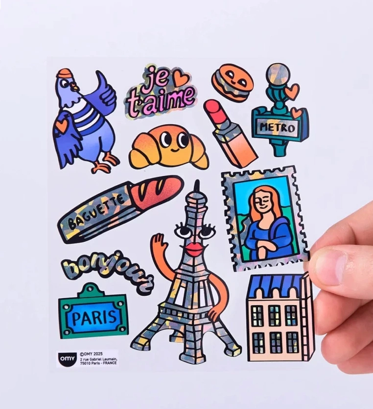 Zestaw Big Paryż to barwna podróż po ulicach francuskiej stolicy bez wychodzenia z domu. Ilustracje nawiązują do codziennego życia miasta – znajdziesz tu motywy rowerów opartych o latarnie, kawiarniane stoliki, maślane rogaliki, szyldy sklepów i charakterystyczne dachy kamienic. Każda naklejka opowiada własną historię i pozwala stworzyć miniaturową paryską scenę na wybranym przedmiocie.