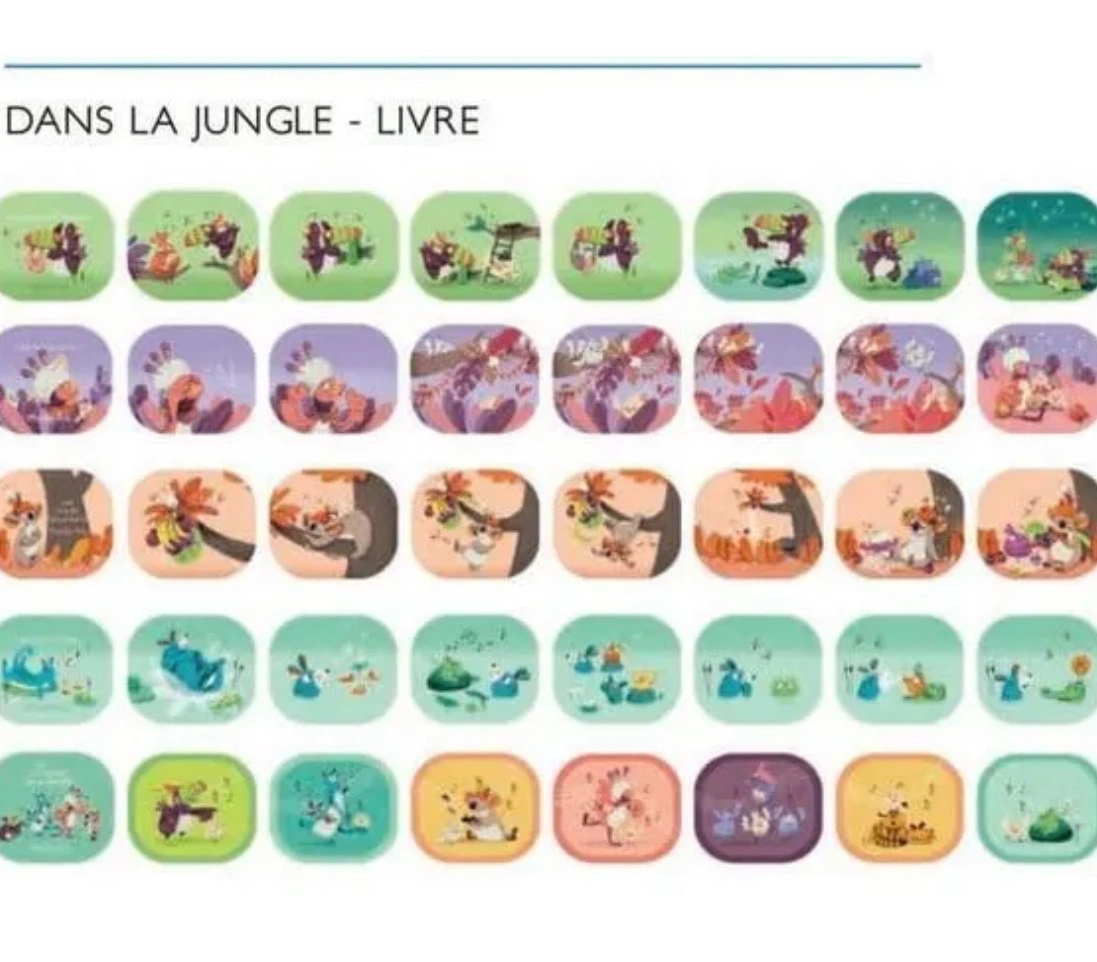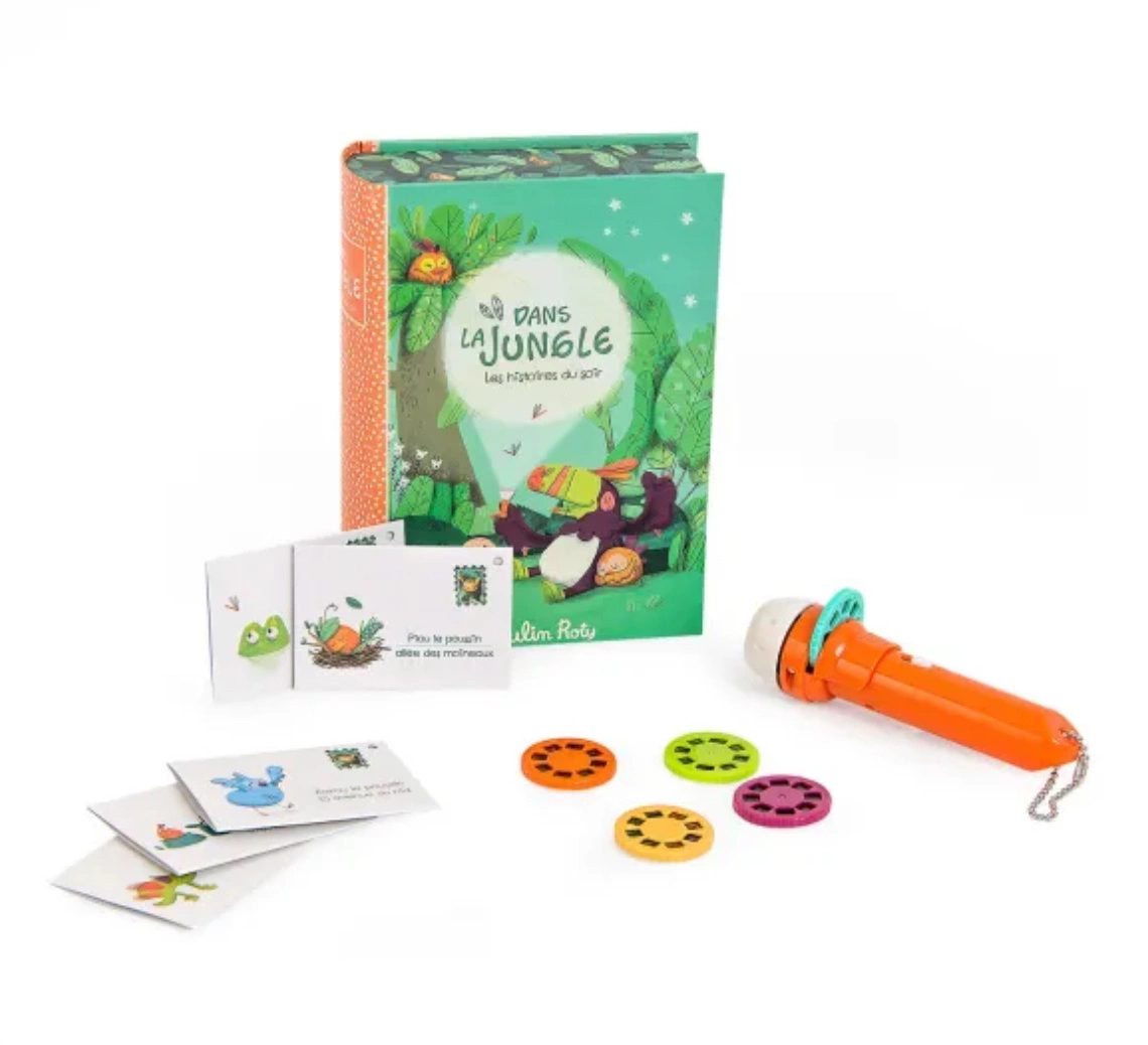 - Zanurz się w magiczny świat wyobraźni z niezwykłą lampką–projektorem Moulin Roty! Ukryta w pięknym pudełku zaprojektowanym na kształt książki, lampka pozwala wyświetlać na ścianie lub suficie pięć barwnych opowieści z kolekcji Dans la Jungle.