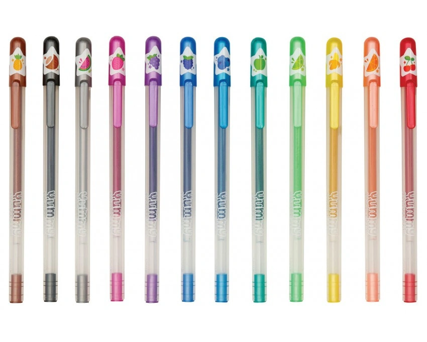 Zestaw zawiera 12 brokatowych długopisów żelowych, a każdy z nich ma swój własny owocowy zapach. W czasie rysowania możesz poczuć aromaty limonki, banana, pomarańczy, wiśni, truskawki, winogron, zielonego jabłka, jeżyn, jagód, arbuza, kokosa czy ananasa. Każdy kolor błyszczy dzięki drobinkom brokatu, dodając pracom wyjątkowego, energetycznego efektu.
