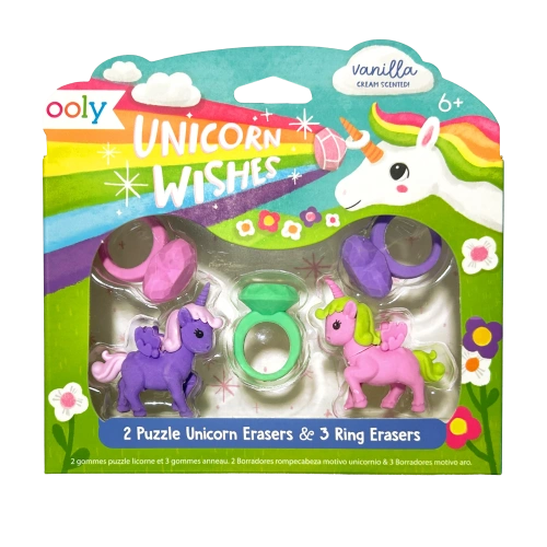 W zestawie znajdują się dwie gumki w kształcie jednorożców, które można rozkładać i składać jak puzzle, oraz trzy pierścionki-gumki, idealne do noszenia lub dzielenia się z przyjaciółmi. Wszystkie pachną słodkim waniliowym kremem i zachwycają pastelową kolorystyką.