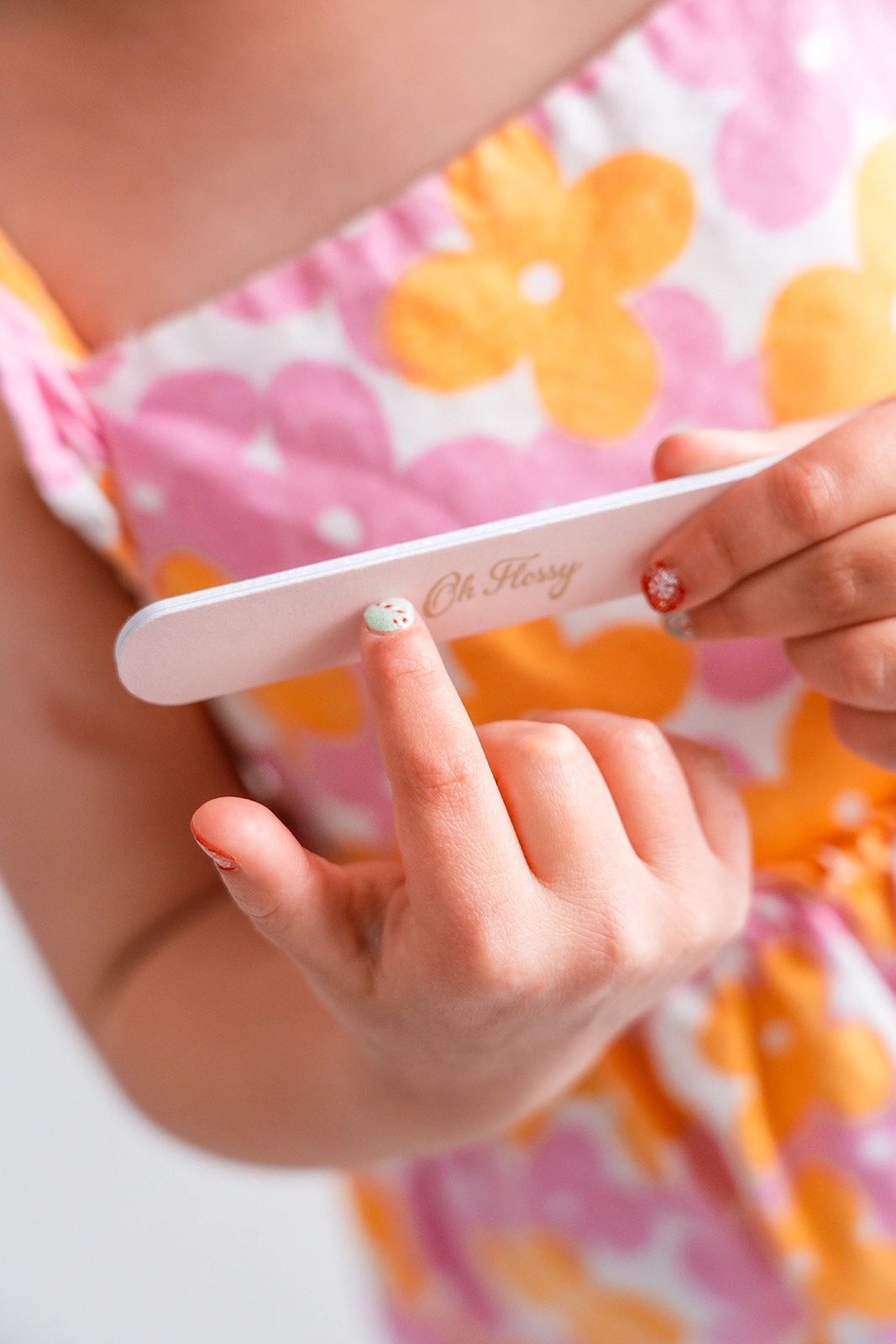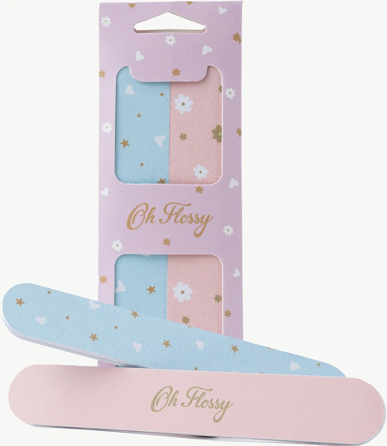 - Zestaw pilników do paznokci Oh Flossy Kids (2 sztuki) z motywami kwiatów i serduszek, idealny do delikatnych dziecięcych paznokci. Doskonały do zabawy w manicure i jako prezent.