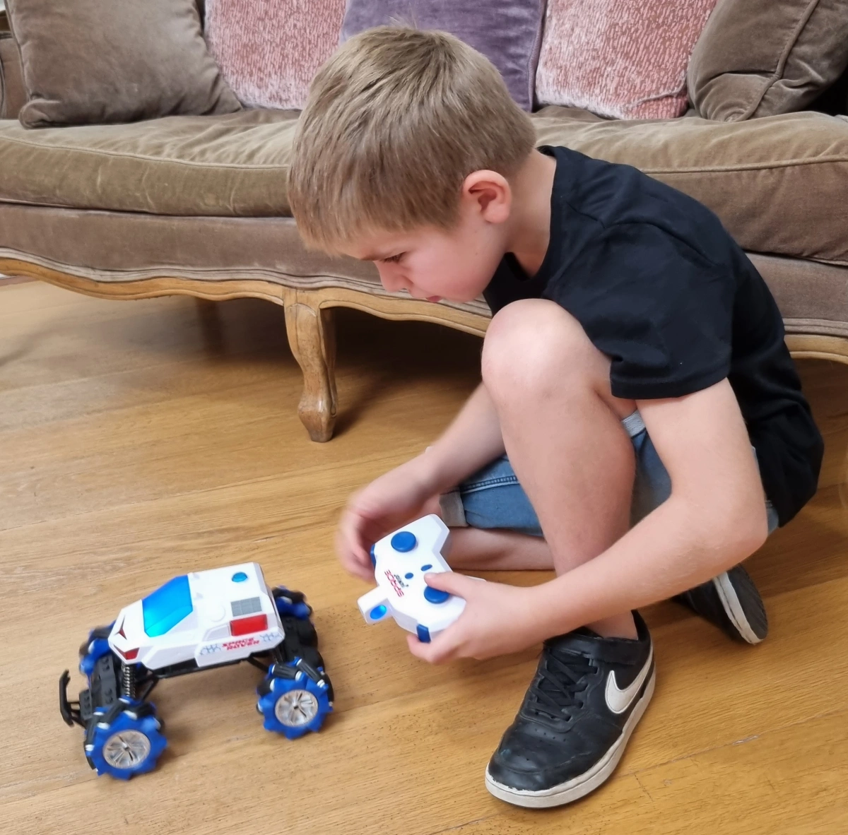 Pojazd porusza się płynnie nie tylko do przodu i do tyłu, ale również na boki, co daje ogromne możliwości manewrowania. Podświetlana przednia szyba i efekty świetlne nadają zabawie widowiskowego charakteru, szczególnie w przyciemnionym pomieszczeniu. Dzięki stabilnej łączności 2,4 GHz samochód reaguje szybko i bez zakłóceń, nawet z większej odległości.