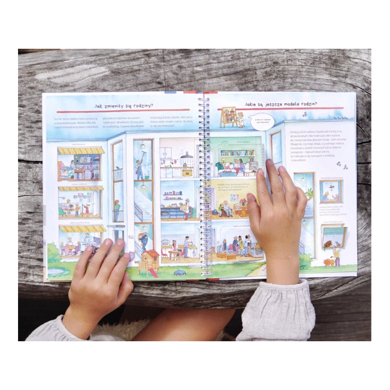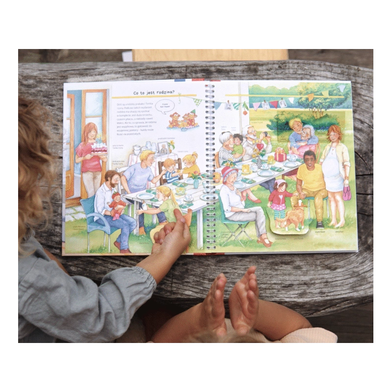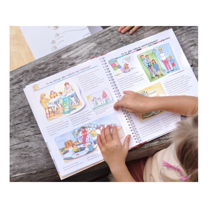 - Książka odpowiada na ważne pytania dotyczące rodzin i relacji w codziennym życiu dziecka. Pokazuje różnorodność rodzin oraz tłumaczy, jak radzić sobie z emocjami i zmianami w domu.