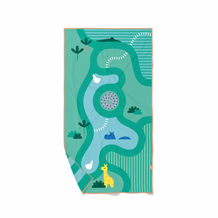 Jedna strona zdobiona jest szerokimi, poprzecznymi pasami, druga – kolorową grafiką inspirowaną safari, przedstawiającą drogi, dzikie zwierzęta i rzeki. Ręcznik ma praktyczną pętelkę do zawieszenia na haczyku. Całość utrzymana jest w odcieniach turkusu i niebieskiego, z kontrastową lamówką.