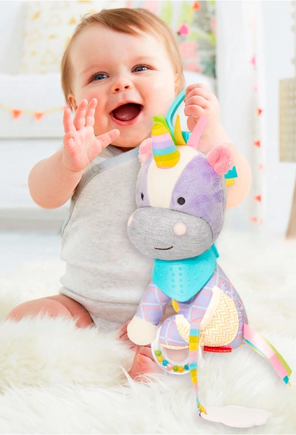 - Zachęć malucha do zabawy i odkrywania świata z zawieszką Bandana Buddies w kształcie Jednorożca od Skip Hop! Ta miękka, wielofunkcyjna zabawka stymuluje zmysły dziecka poprzez różnorodne faktury, kolory i dźwięki.