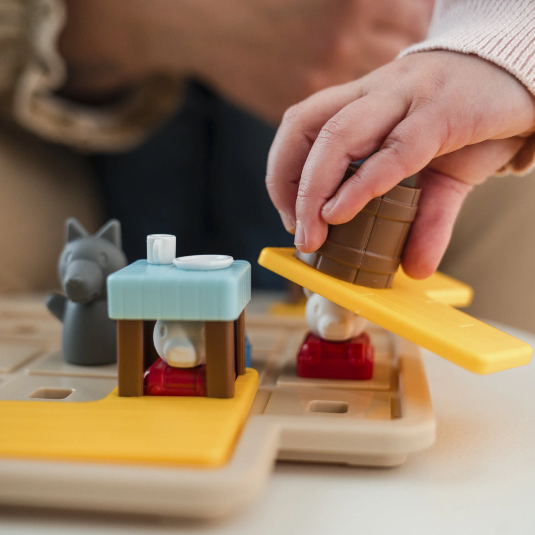 Pomóż koźlątkom schować się przed złym wilkiem! W grze logicznej Wilk i Siedem Koźlątek dziecko staje przed zadaniem dobrania odpowiednich kryjówek dla siedmiu koźlątek, aby uchronić je przed niebezpieczeństwem. Każda koza i każdy mebel mają inny kształt, więc dziecko musi dokładnie dopasować elementy do planszy.