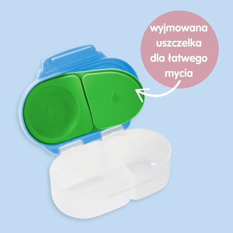 - Uniwersalny pojemnik na przekąski z elastyczną uszczelką umożliwiającą schowanie do niego całego owocu takiego jak jabłko. Przegrody są szczelne i można ich używać do przecierów, jogurtów i dipów.