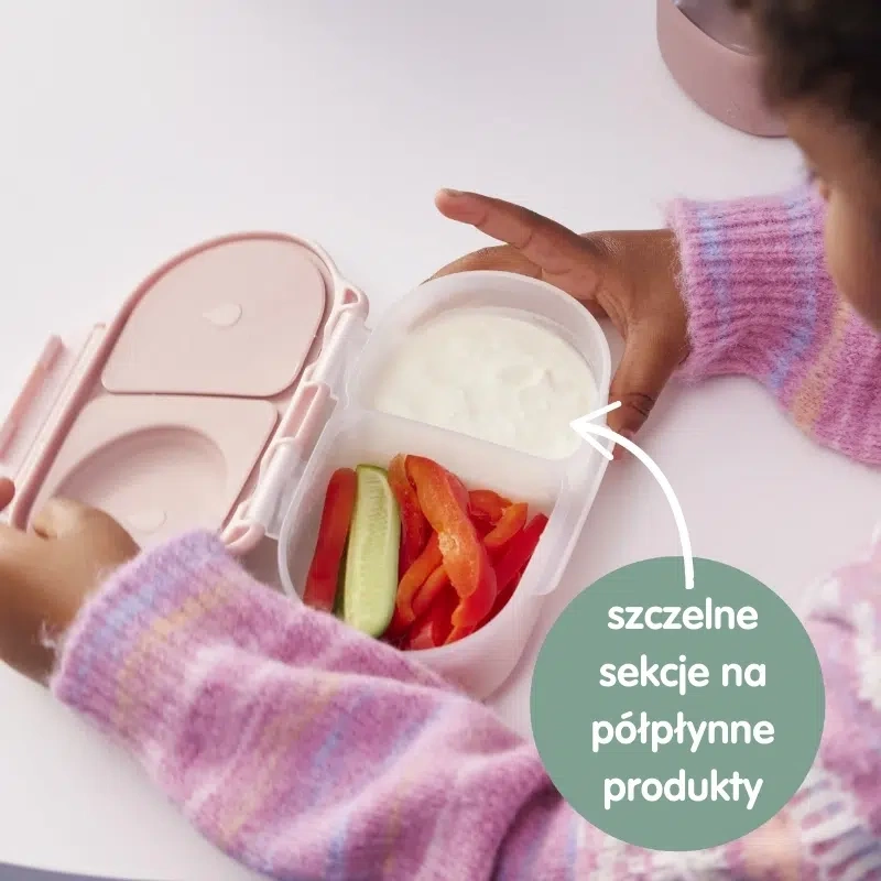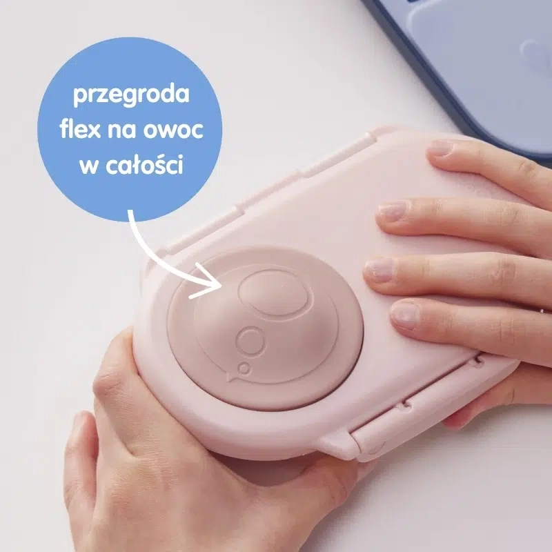 Niewielki pojemnik z przegródkami marki b.box wyposażony jest w wyjątkową silikonową uszczelkę, która zapewnia szczelność pudełka. Dzięki temu możesz zapakować do niego ulubiony dip, jogurt z owocami, a także – dzięki elastycznej pokrywce typu flex – całe jabłko. Silikonowa uszczelka w tym miejscu zapewnia odpowiednią szczelność, jednocześnie umożliwiając jej łatwe zdjęcie i dokładne umycie, co zapewnia higieniczne użytkowanie po każdym posiłku.