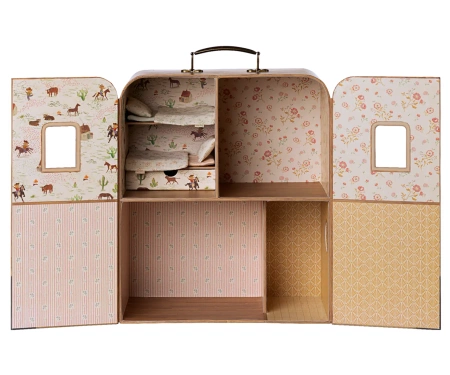 - Otwórz drzwi do miniaturowego świata Maileg z uroczym domkiem Suitcasa – przenośną walizeczką, która staje się idealnym miejscem do zabawy dla Małej Siostry i Małego Brata Myszki.