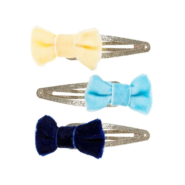 - Komplet trzech spinek do włosów Olda holenderskiej marki Souza! Każda spinka ozdobiona jest aksamitną kokardką w jednym z trzech kolorów: jasnożółtym, jasnoniebieskim i granatowym.