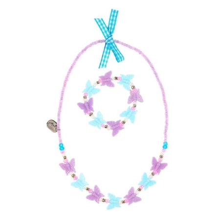 - Naszyjnik + bransoletka Esmay holenderskiej firmy Souza to komplet biżuterii z małych koralików oraz elementów w kształcie motyli w kolorach fioletowym + turkusowym z kilkoma koralikami w bieli, złocie oraz różu.