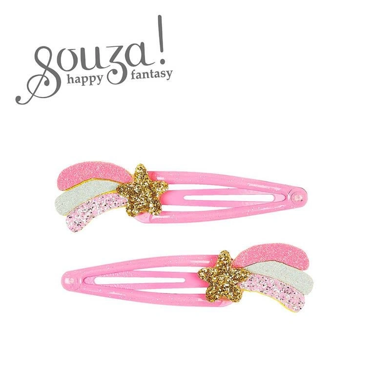 - Komplet spinek Souza! z brokatowymi różowo-złotymi kometami. Stabilne zaciski na klik. Idealne na co dzień i przyjęcia. Długość 5 cm, świetne na prezent dla dziewczynek od 3 lat.
