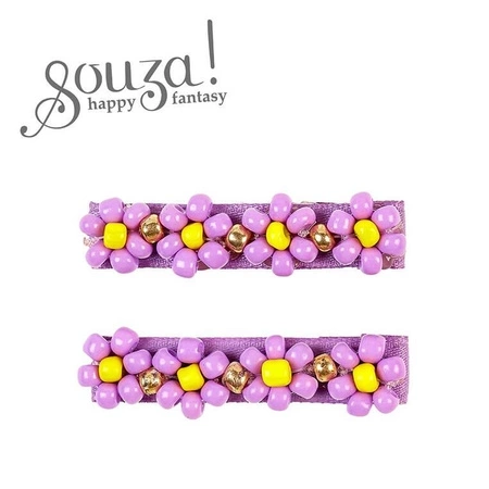 - Komplet dwóch spinek Souza! z fioletowymi, złotymi i żółtymi koralikami. Stabilne, pokryte rypsową wstążką. Idealne na co dzień i na przyjęcia. Długość 5 cm, świetne na prezent.