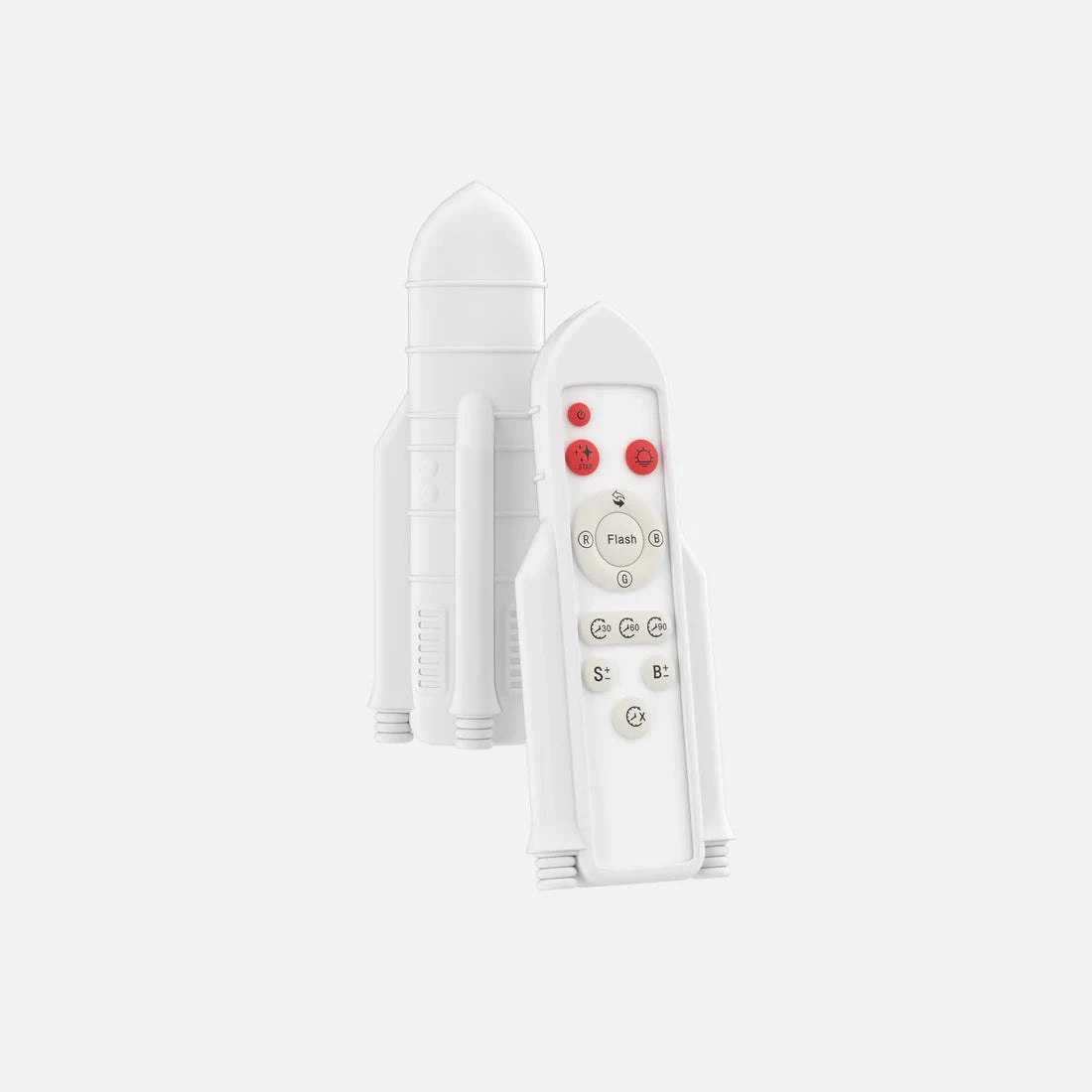 Pilot w kształcie rakiety z miękką silikonową osłoną umożliwia sterowanie jasnością, kolorami, trybami oraz ustawienie timera (30 lub 60 minut) – bez potrzeby wstawania.