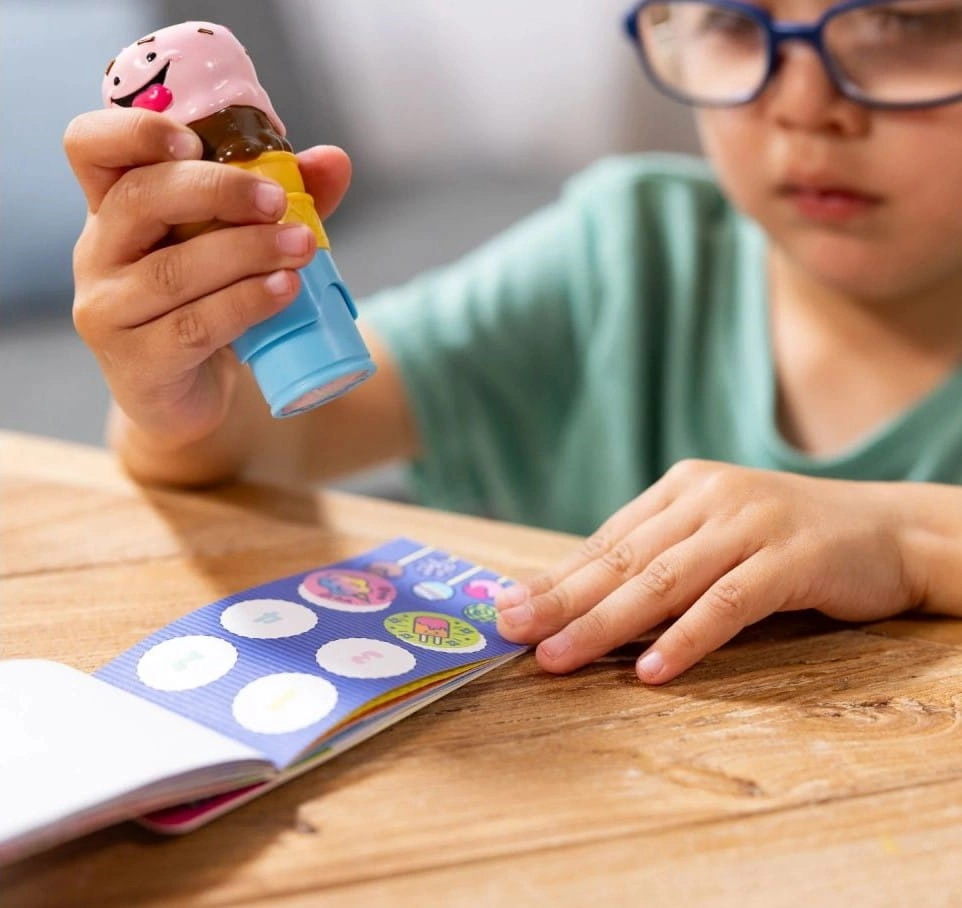 Do zestawu dołączono notesik z 24 stronami pełnymi ciekawych zadań na liczenie, dopasowywanie i tworzenie, oraz aż 200 unikalnych naklejek z motywami „Favorite Things” — jednorożce, lody i wiele innych. Wystarczy umieścić naklejki w specjalnym stemplu Sticker WOW! (stempel dostępny oddzielnie) i „stemplować” na kartkach notesu. Każda stemplowana naklejka to mała niespodzianka!