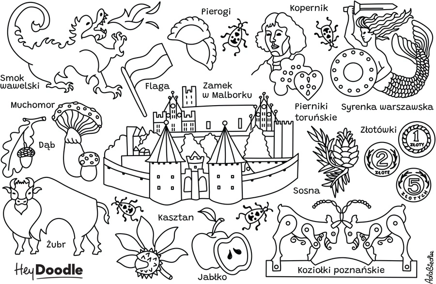 - Wielorazowa mata silikonowa HeyDoodle w formacie A4 zaprasza dzieci do kreatywnego kolorowania ilustracji przedstawiających znane symbole, miejsca i postacie związane z Polską.