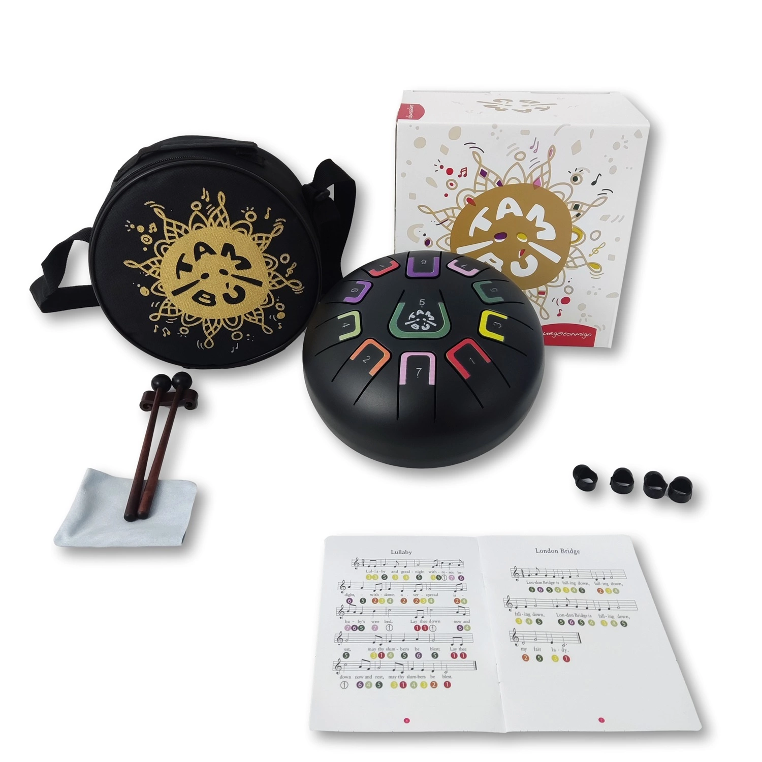 - Tambu to wyjątkowy bębenek językowy, który łączy relaksację i kreatywność. Wykonany ze stali, ma 8 cali (20 cm) średnicy i oferuje 11 harmonijnych tonów, które umożliwiają tworzenie pięknych melodii.