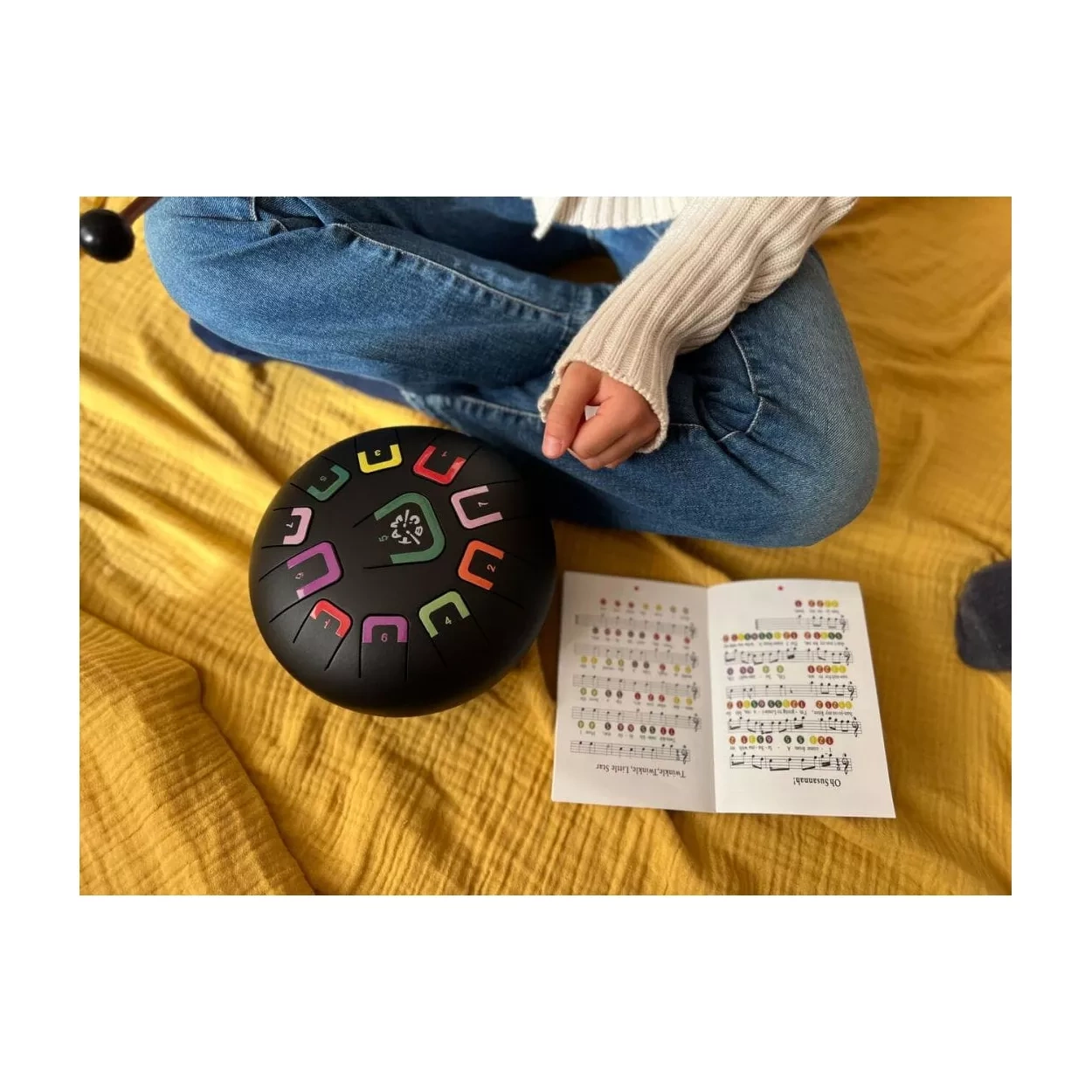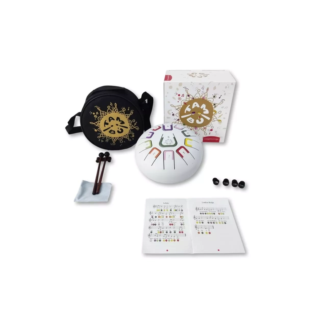 Bębenek Tambu został zaprojektowany z myślą o intuicyjnej nauce i radości z gry. Oznaczenia cyfrowe i kolorowe, zgodne z metodą Montessori, pomagają początkującym muzykom łatwiej odnaleźć się w świecie dźwięków. Do zestawu dołączony jest zeszyt z nutami, który inspiruje do tworzenia własnych melodii i rytmów.