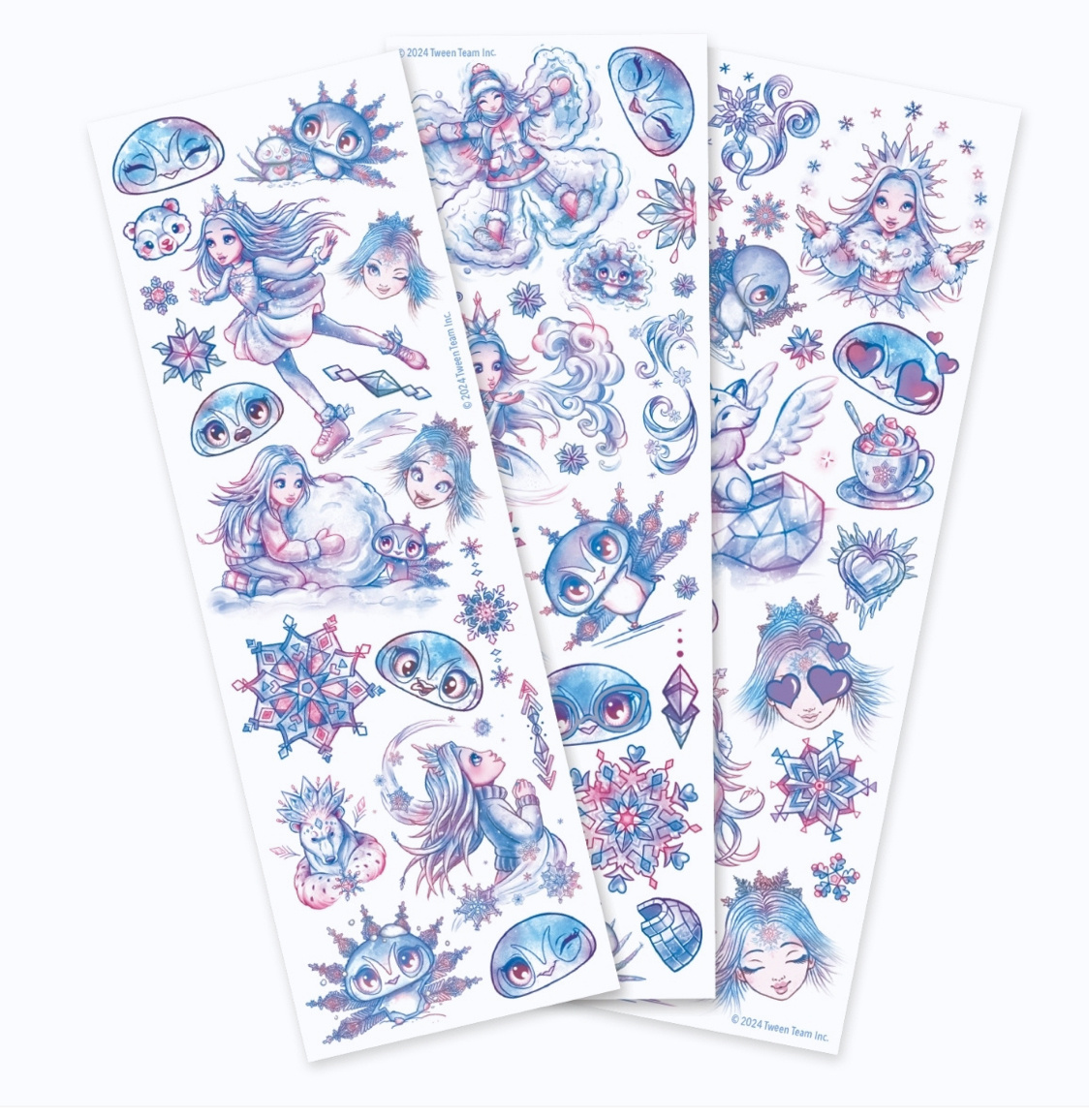 Wprowadź dziecko w bajkowy klimat lodowych krain z zestawem tymczasowych tatuaży inspirowanych postaciami Iceany i Blizzii. Subtelne ilustracje w chłodnej palecie barw – fiolety, błękity i morska zieleń – przenoszą wyobraźnię do świata śnieżynek, magicznych stworzeń i zimowego piękna.