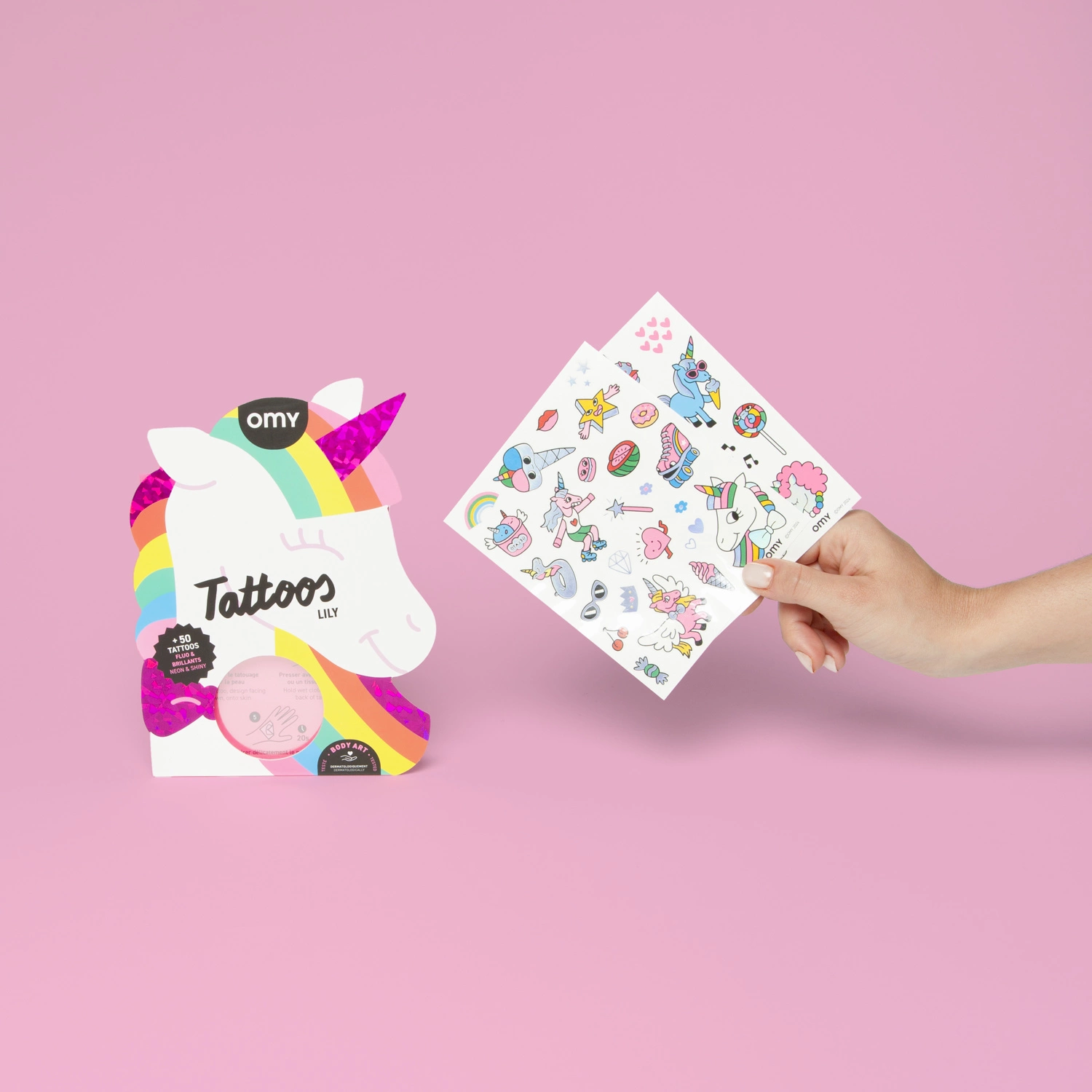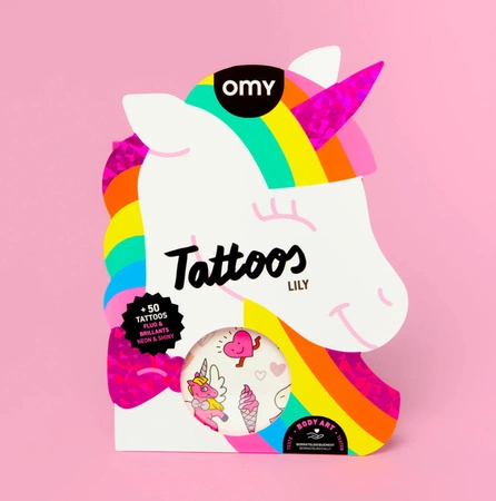 - Wejdź do delikatnego, pełnego uroku świata Lily Jednorożca – maskotki marki OMY. Ten starannie zilustrowany arkusz zawiera 50 tymczasowych tatuaży w żywych neonowych kolorach i błyszczącym złocie
