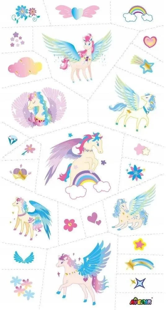 Dla miłośników tatuaży oraz jednorożców to prawdziwy raj! Kolorowe tatuaże marki AVENIR pozwolą cieszyć się ulubionymi motywami, w preferowanych kolorach. Będą wspaniałą ozdobą podczas wakacji lub imprezy, utrzymują się od 3-5 dni. To produkt idealny na drobny upominek lub dodatek do prezentu.