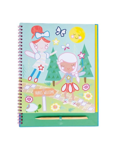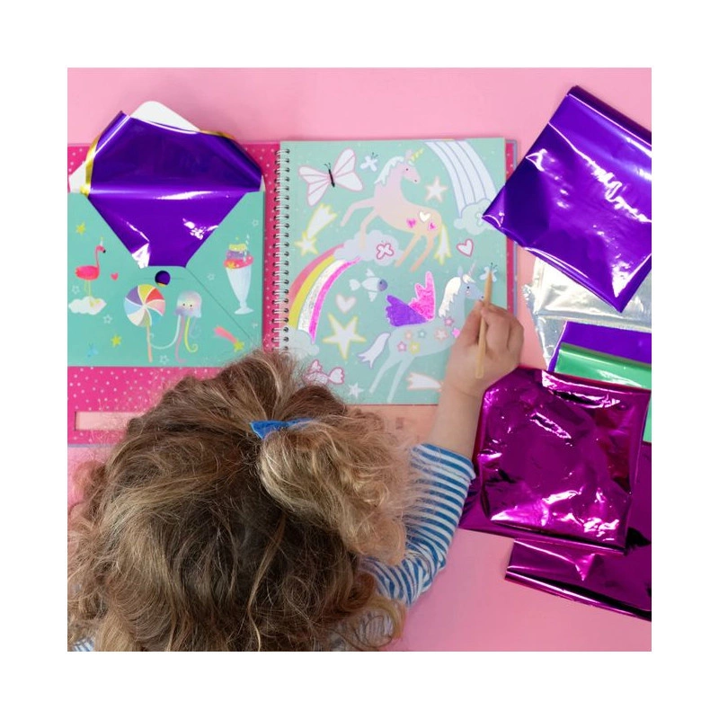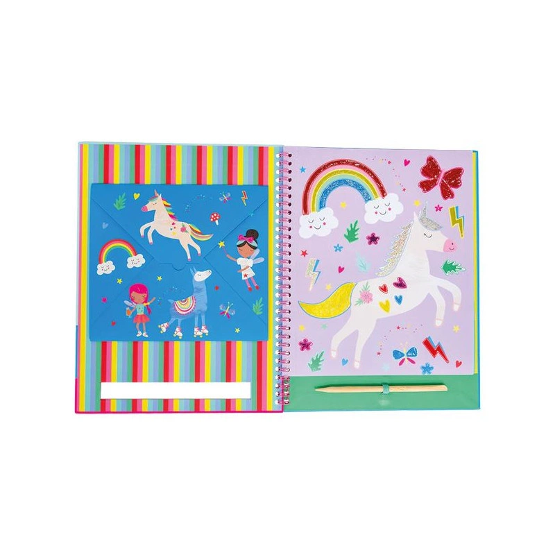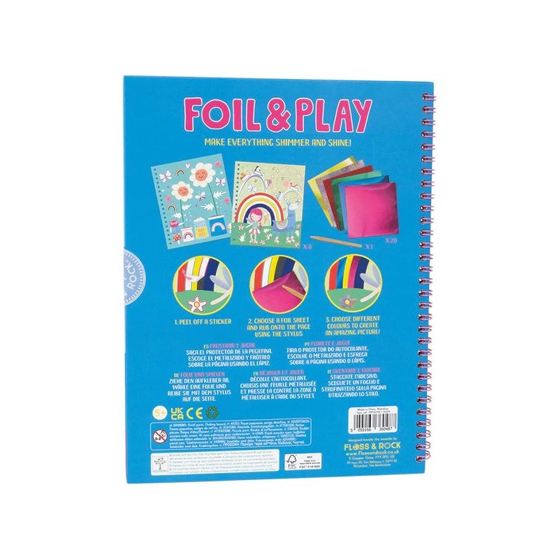 Odklej białą naklejkę, wybierz jeden z kolorowych arkuszy folii i użyj drewnianego rysika, aby przenieść folię na naklejkę i stworzyć wspaniałe obrazki! Zestaw zawiera 20 różnorodnych arkuszy foliowych, 8 pięknych stron z motywem tęczowych wróżek oraz drewniany rysik – wszystko w poręcznej książeczce z spiralnym grzbietem, która jest idealna do zabrania wszędzie.