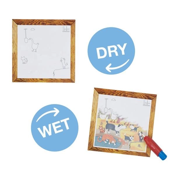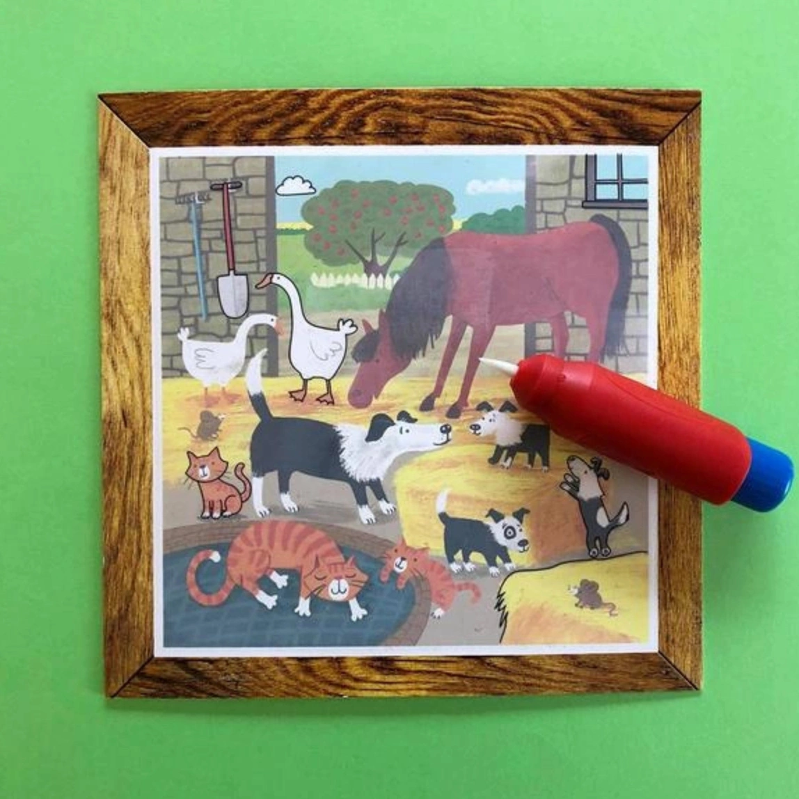 W komplecie znajdują się cztery ilustracje z motywem farmy, które „ożywają” pod wpływem wody. Wystarczy napełnić pędzelek wodą i przesunąć nim po karcie, by odkryć ukryte obrazki. Gdy woda wyschnie, ilustracje znikają – i zabawa może zacząć się od nowa.
